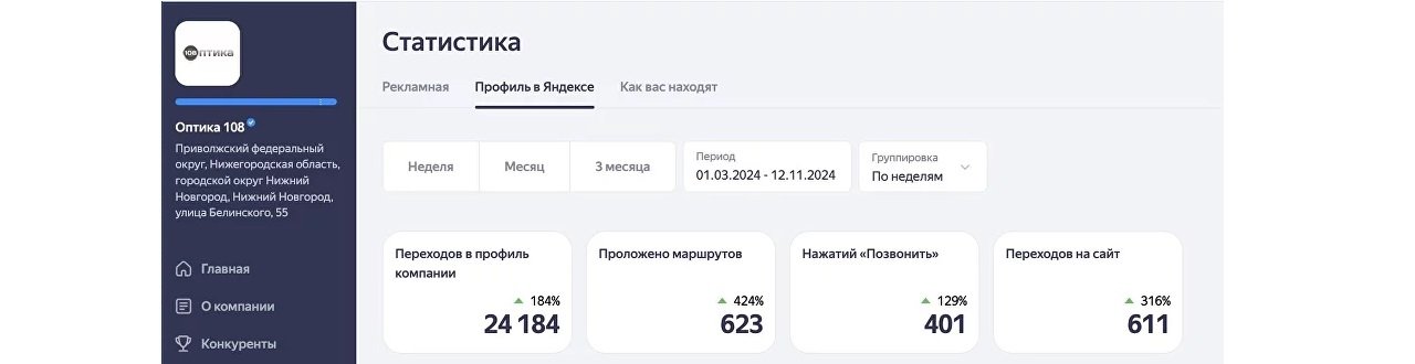 Значительный рост показателей профиля «Оптики 108» на Яндекс Картах за полгода активной рекламной деятельности позволил обеспечить существенное увеличение количества качественных конверсий, а значит и коммерческой отдачи от использования данного маркетингового инструмента для клиента: