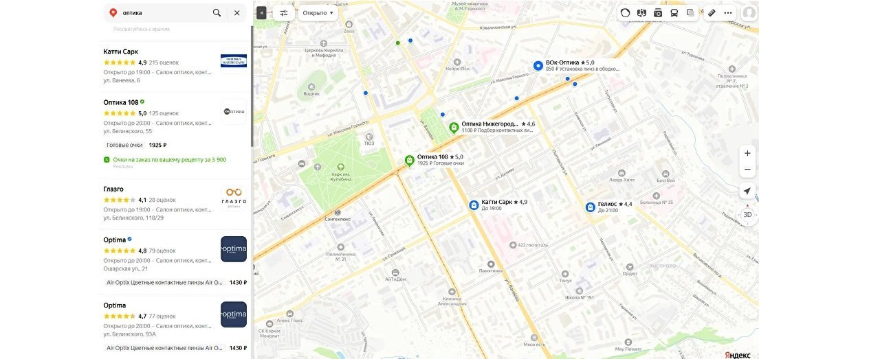Уже через месяц ( к апрелю 2024 г.) после начала активных работ карточка компании «Оптика 108» вошла в ТОП-3 Яндекс Карт по ключевым запросам — «оптика», «купить очки», «контактные линзы» — и сохраняет позиции в настоящее время.