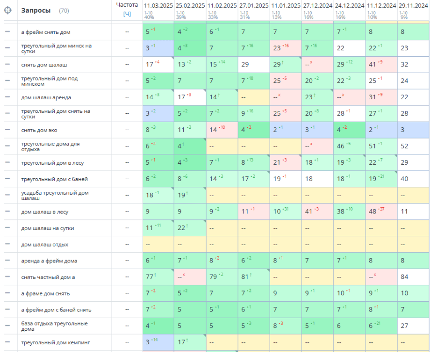За 4 месяца активной работы сайт вышел в ТОП-10 Google по ключевым запросам, связанным с арендой треугольных домиков в Минской области. Доля запросов в топовой зоне увеличилась в 4,5 раза (с 9% до 40%), что привело к: