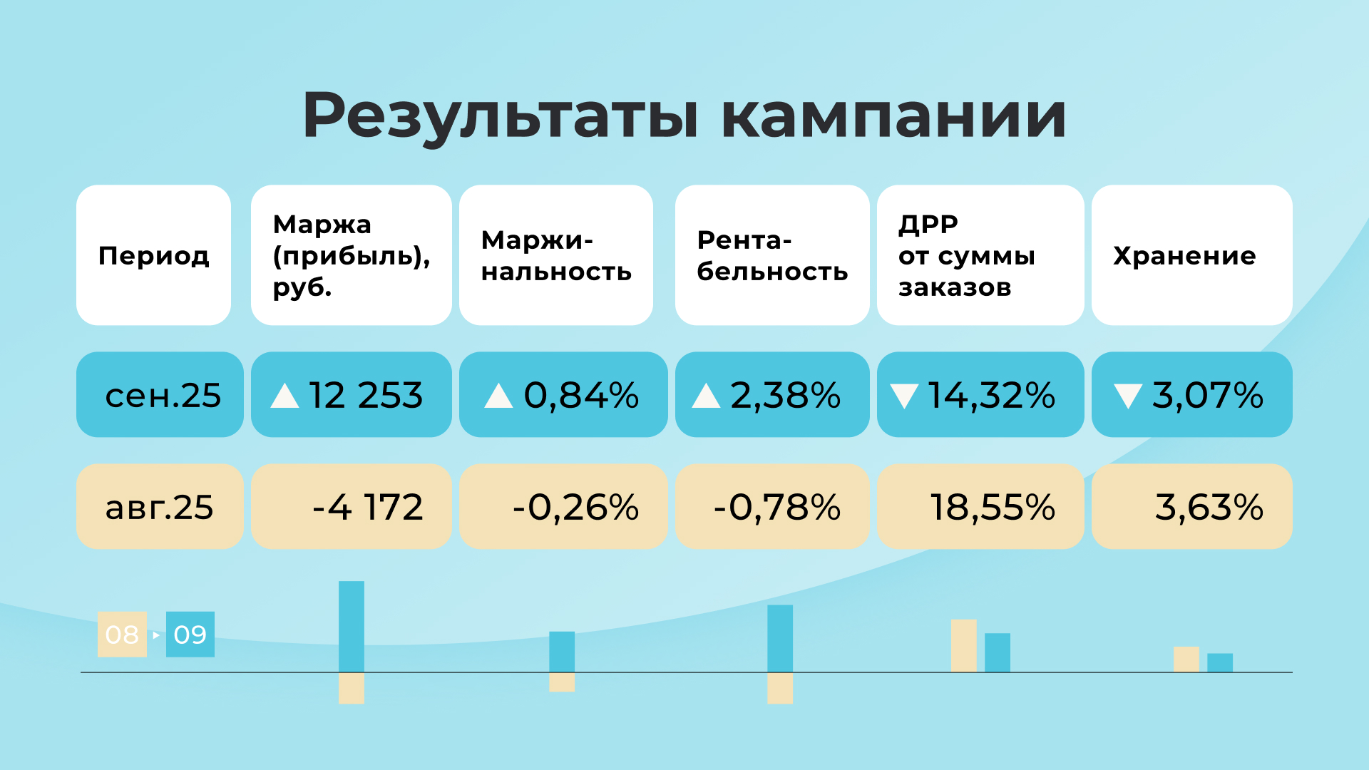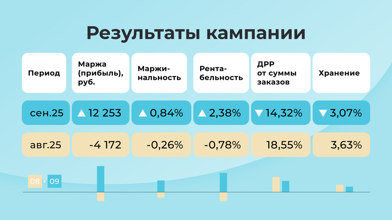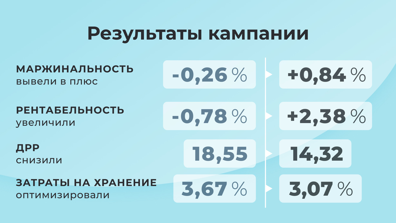 Реклама настроена на все товары, что создавало огромный перерасход бюджета. Настроили рекламу точечно только на топовый товар из связки, чтобы продвигать всю связку по минимальной ставке. Тем самым сократили ДРР (долю рекламных расходов, показатель эффективности рекламы) с 18,55% до 14,32%.