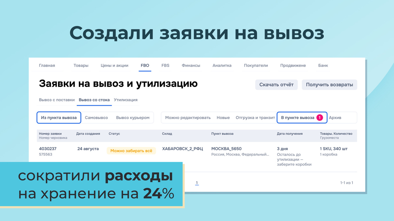 Сделали заявки на вывоз, сократили расходы на хранение на 24%. Помним, что на Маркетплейсах мы зарабатываем не только ростом продаж, но часто за счет снижения расходов..
