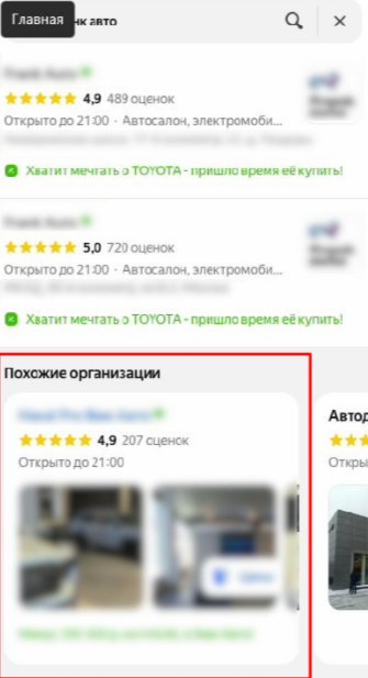 Суть механики: при вводе пользователем брендового запроса прямого конкурента в блоке организаций дополнительно отображается карточка другого дилера. Таким образом, компания получает возможность появляться в момент, когда клиент уже находится на стадии выбора.