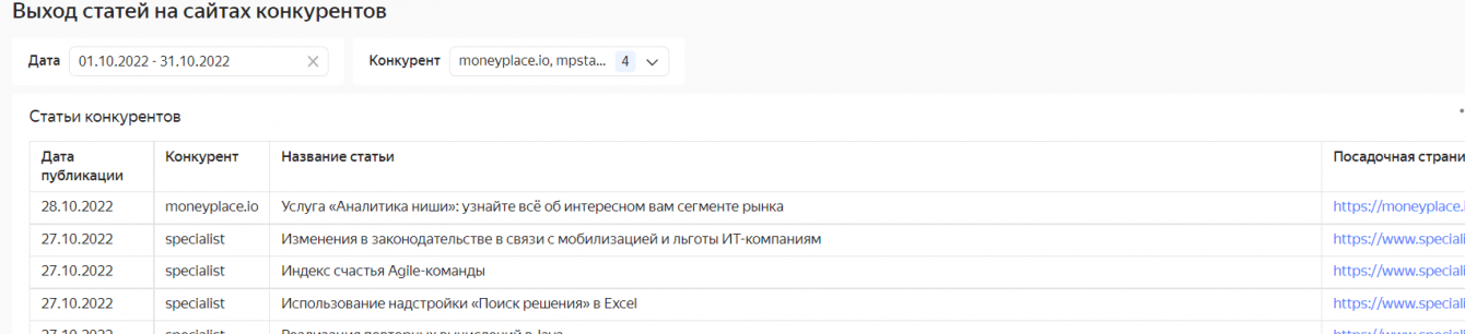 Во время SEO-продвижения команда проекта подготовила дашборд, где можно оперативно отслеживать все метрики. В нем можно посмотреть статистику за любой период по трафику, позициям, лидам и интерес к статьям. Здесь видны не только показатели «Анабара», но и показатели конкурентов: расстановка к выдаче, посещения, регистрации и конкурентный спрос.