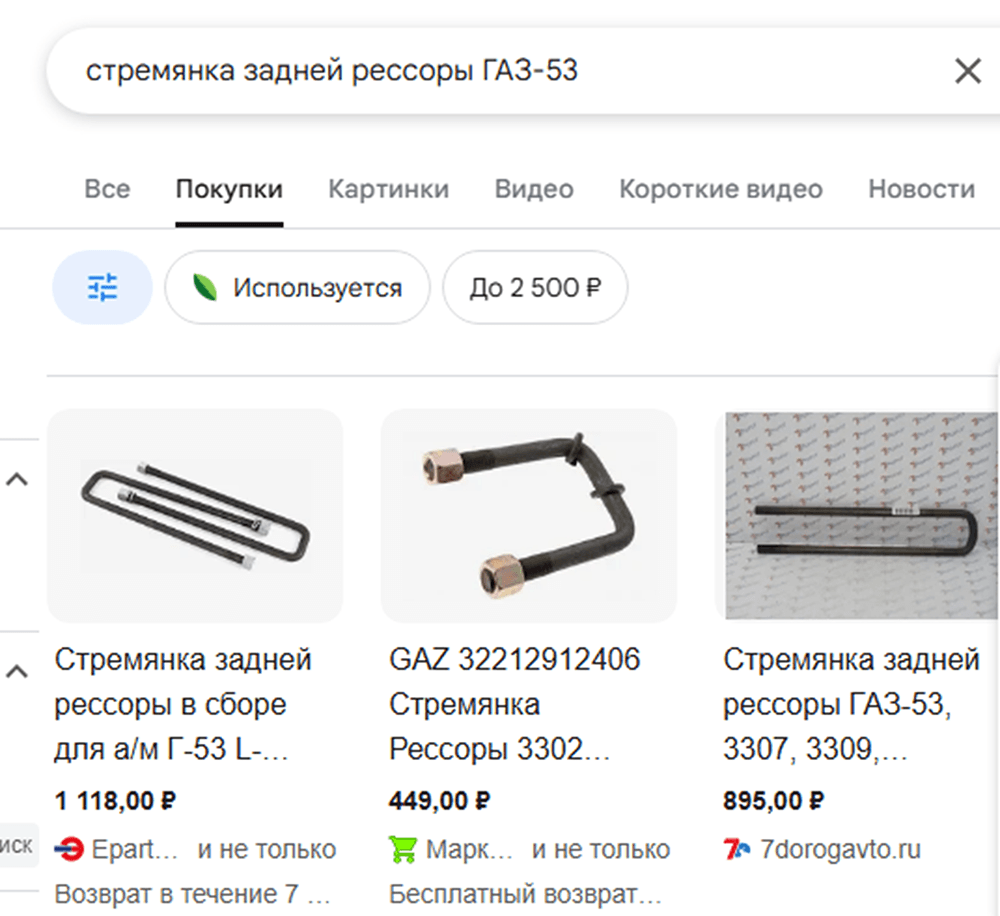 Следующим шагом стало подключение фида в Google Merchant. Это случилось позже — уже в 2024 году — но эффект был сравнимо сильным. Особенно хорошо фид сработал по горячим и конкретным товарным запросам. Те, кто искал, к примеру, «Форсунку топливную ВАЗ-1118» или «стремянку задней рессоры ГАЗ-53», попадали в визуальную витрину с изображениями, ценами и рейтингами — и могли выбрать нашего клиента напрямую.
