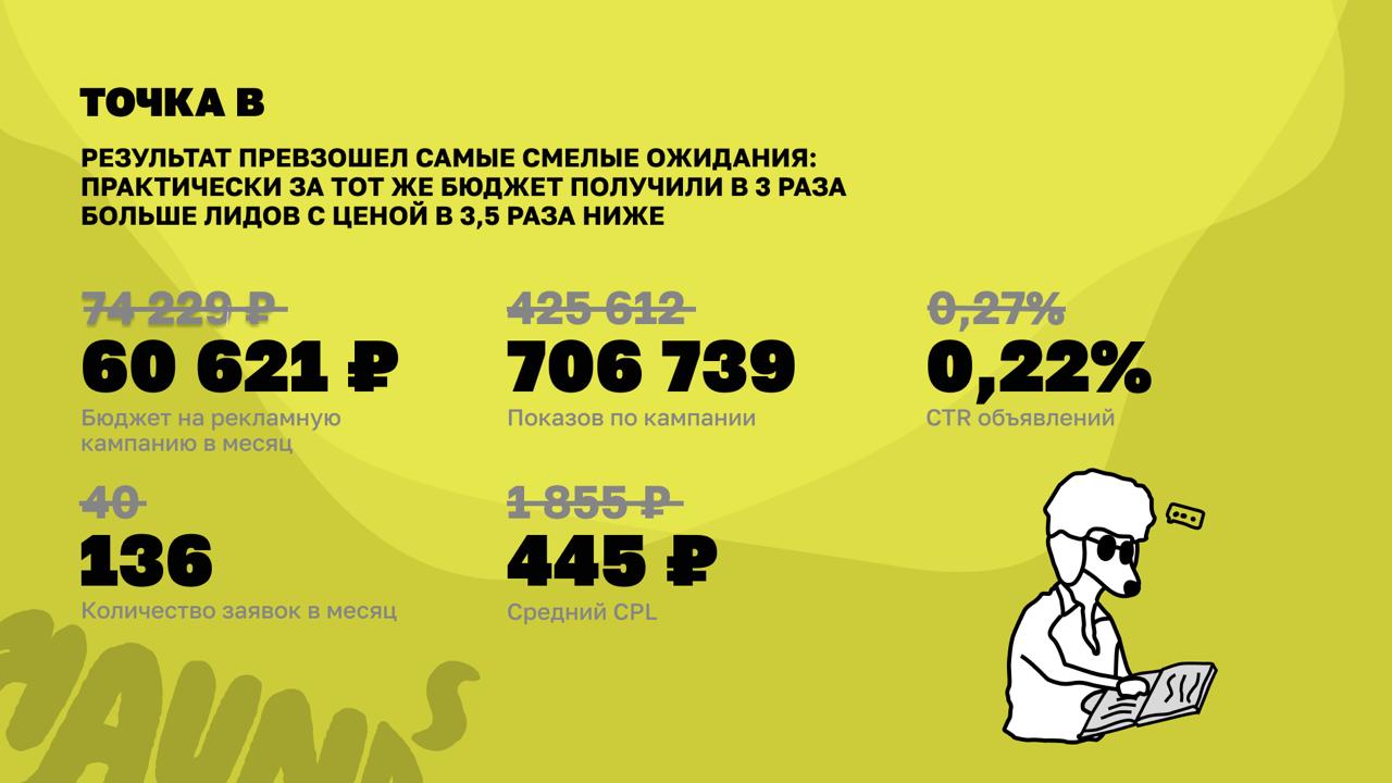 Когда ты четко знаешь, на какие рычаги нужно нажимать, как преподносить оффер, какой длины оптимально делать лид-форму и еще множество мелочей, результат становится прогнозируемым, но от этого не менее приятным. CPL стал стоить клубу на 76% меньше, а лидов стало в 3,4 раза больше! Надеемся, премию маркетологу World Class за это уже выписали :)