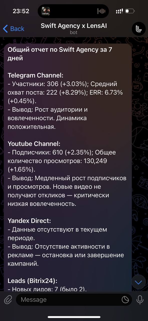 Уже после первых отчётов стало ясно, где мы теряем деньги. ИИ подсветил: какие кампании в Директе тянут бюджет вниз, на каких этапах сделки чаще всего зависают, и какие задачи в Trello блокируют проекты. Команда перестала «гадать» и получила прозрачные ориентиры.