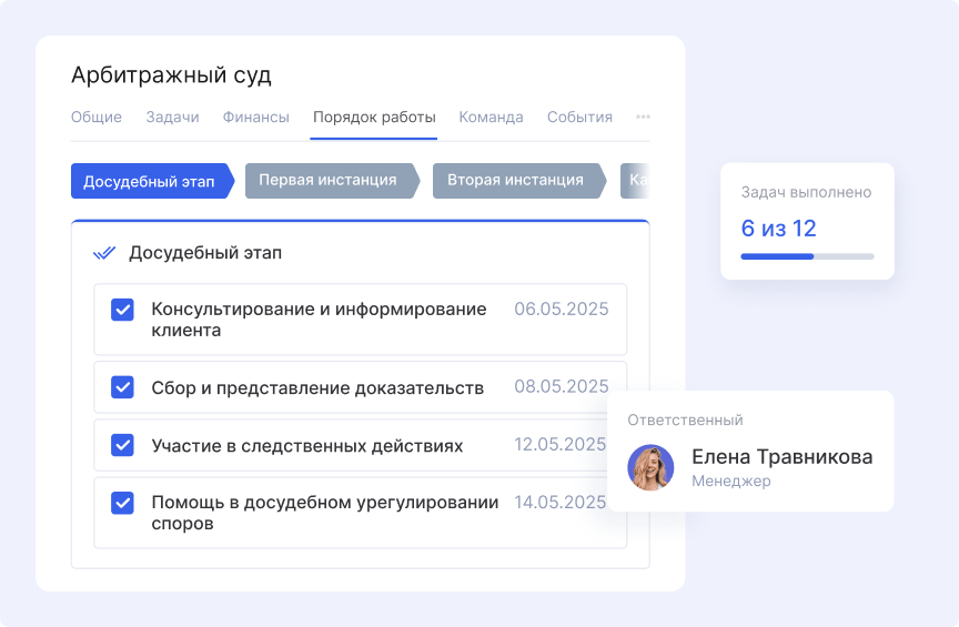 • Проектный модуль (шаблоны): Для типовых дел (например, банкротство физлиц) создали шаблоны проектов с фиксированными этапами: анализ финансов, подготовка документов, подача заявления, участие в суде. Это ускорило запуск новых дел — не нужно каждый раз придумывать структуру с нуля.