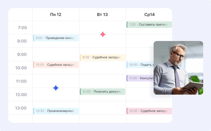 • Финансовый модуль и календарь: Настроили автоматическое формирование счетов по этапам и интеграцию с банками. Общий календарь синхронизирует заседания и встречи, чтобы исключить наложения и пропуски сроков.