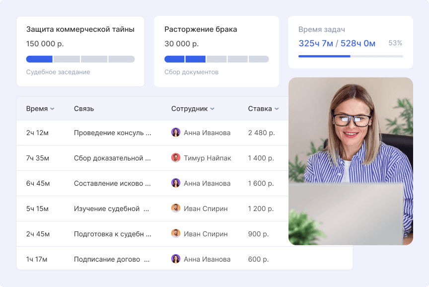 Мы провели внедрение CRM-системы Аспро.Cloud, которая закрыла все ключевые потребности юридического бизнеса: от учета времени до финансового контроля.