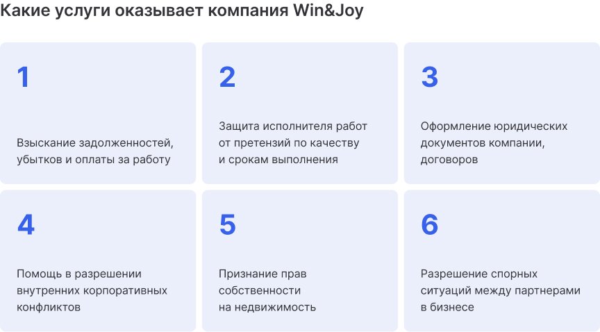 Юридическая компания Win&Joy с 2015 года специализируется на арбитражных спорах, банкротствах и корпоративных конфликтах. За 10 лет работы команда реализовала более 100 проектов для таких клиентов, как агрохолдинг «Московский», сеть аптек «Мелодия здоровья» и АО «Энергокомплекс».
