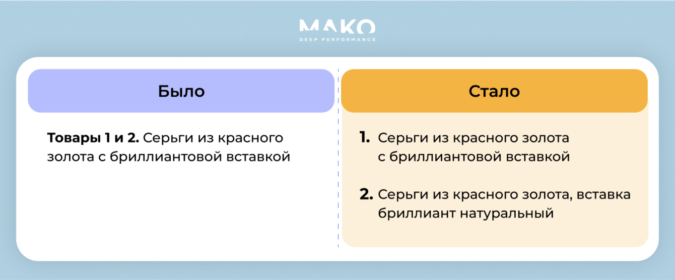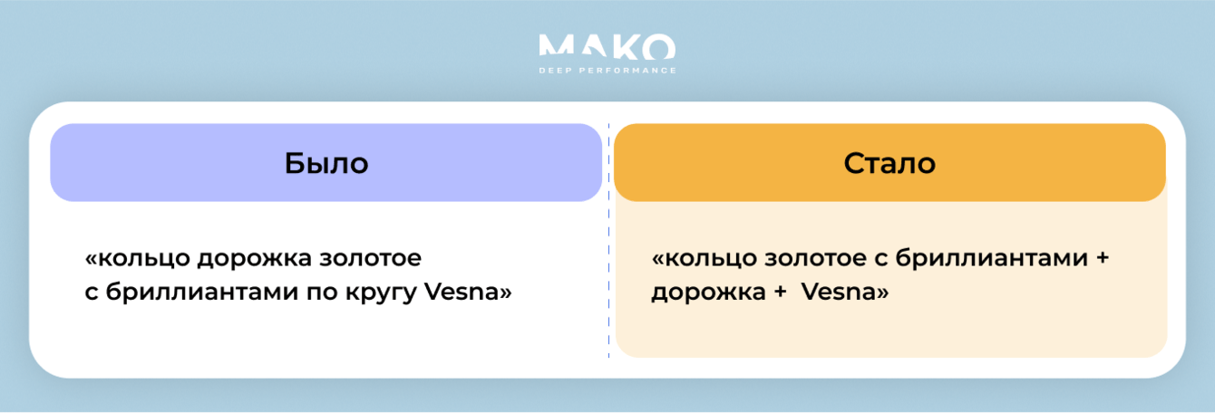 Для каждой категории украшений разработали свой шаблон. За основу брали высокочастотный релевантный запрос, по которому чаще всего покупают. К нему добавили другие характеристики товара.