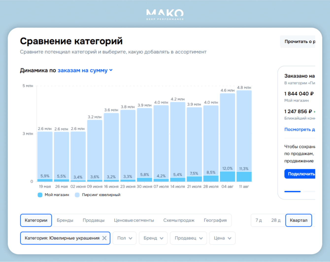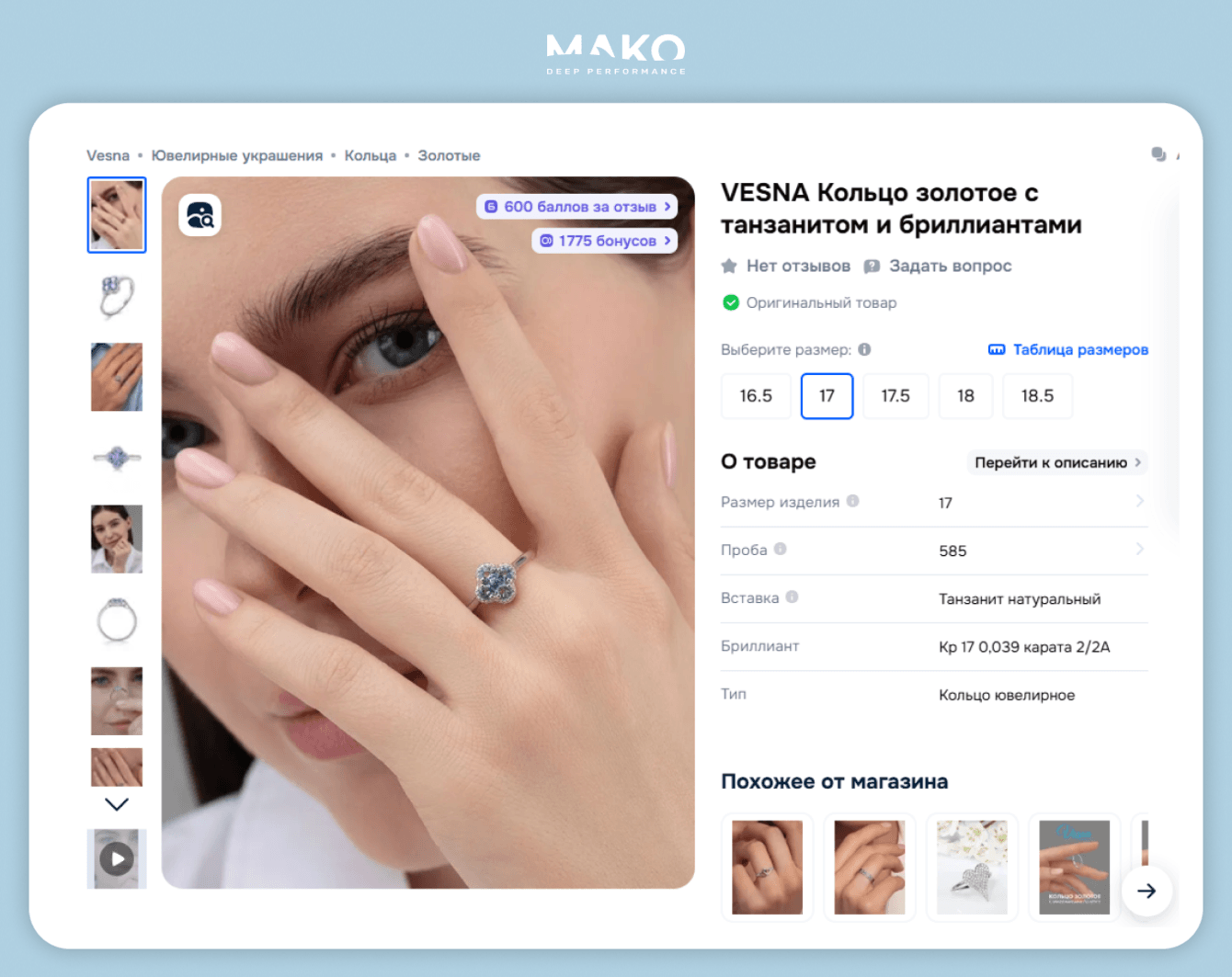 — Хотим с помощью МАКО увереннее зайти в эти категории. Понадобится помощь агентства с планированием поставок: у каждой модели кольца свой размерный ряд, важно поддерживать остатки в нужном количестве, но без перегрузки.