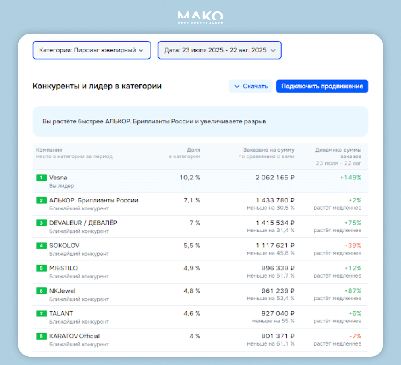Бренд Vesna вырос в рейтинге ювелирных магазинов Ozon по выручке на 65 пунктов и поднялся со 170 на 106-е место.