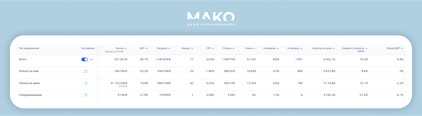 Общий ДРР по кабинету составил 5,4%. Доля рекламных расходов по кампаниям с оплатой за клик еще выше желаемых показателей, зато мы получили 805 добавлений в корзину, которые потенциально станут заказами. Дальше оптимизируем рекламу для снижения ДРР.