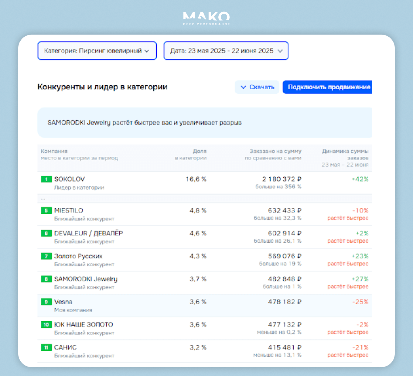 Бренд Vesna вырос в рейтинге ювелирных магазинов Ozon по выручке на 65 пунктов и поднялся со 170 на 106-е место.
