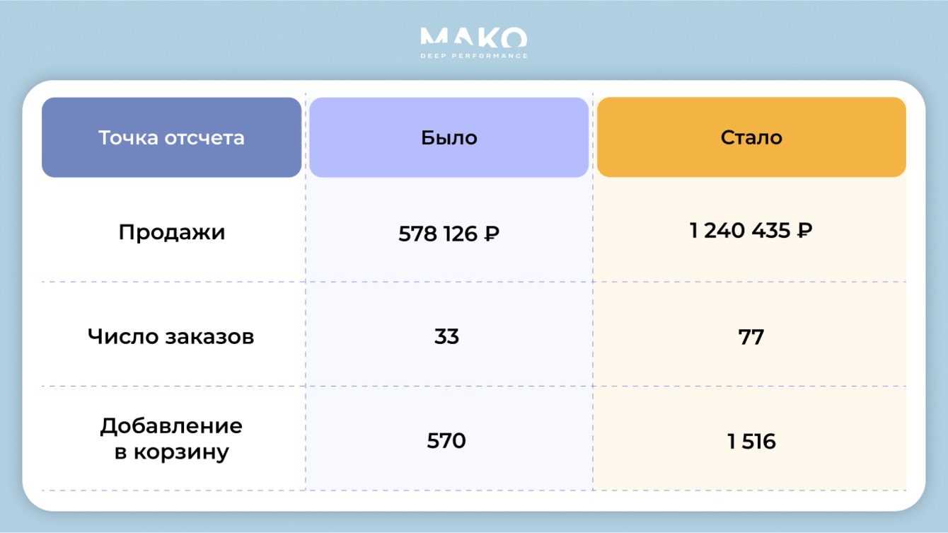 Продажи из рекламы увеличились на 662 309 рублей, число заказов приросло в 2,3 раза.
