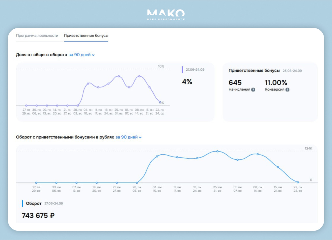 За 3 месяца приветственные бонусы позволили увеличить оборот на 743 700 рублей.