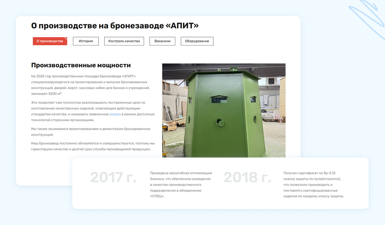 1. «О компании». Раздел, где описана история компании, её масштабы, ценности, команда и производственные возможности. Для промышленного предприятия это тоже важно – партнёры хотят знать, с кем имеют дело. Часто подразделы «О компании» включают историю развития, достижения, производственные мощности (станки, цеха), фотографии и видео с производства, а также сертификаты и лицензии. Такой раздел подтверждает, что у компании есть нужный опыт и ресурсы. Рекомендуем отдельно выделять преимущества и уникальные компетенции компании, причём конкретно: вместо общих фраз вроде «высокое качество» – факты, например, собственная лаборатория, 20 лет на рынке, ISO-сертификаты и так далее. Сертификаты, лицензии, свидетельства сильно повышают доверие, особенно если клиенту важно соответствие стандартам.