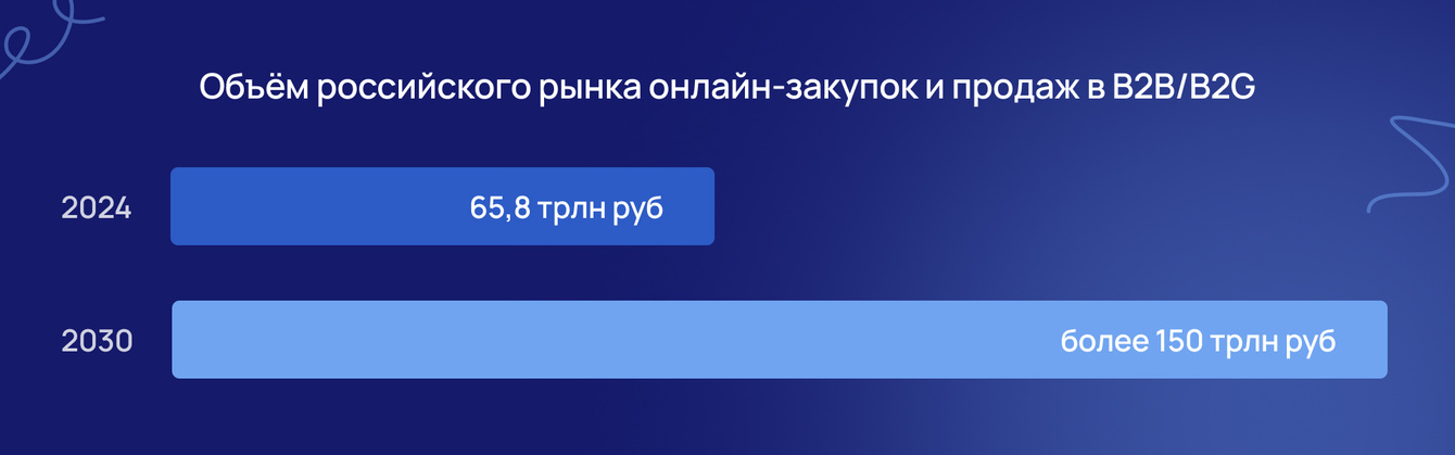 - поиск в интернете. Многие новые клиенты приходят, найдя компанию через Яндекс. Сайт здесь играет самостоятельную роль: посетителей приводит оптимизированный под профильные запросы контент (каталоги, технические страницы). Без такого входящего потока компания бы полагалась только на холодные продажи и выставки. По данным июльского отчёта 2025 года Data Insight, объём российского рынка онлайн-закупок и продаж в B2B/B2G в 2024 году составил 65,8 триллионов рублей, прогноз к 2030 году – более 150 триллионов рублей.