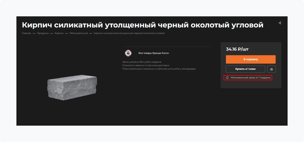 ● Установили, что цены на кирпич обычно указываются за штуку, но продаются поддонами — эту информацию добавили в карточки товаров.