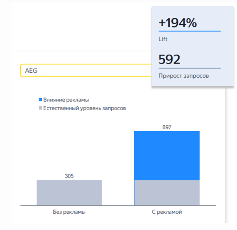 2. Коллеги из «Яндекса» первично провели анализ Search Lift по общей маске, а не по тематическому шлейфу, который относится к инструментам. Повторный анализ по нужному шлейфу динамики не показал. Это говорит о том, что пользователи осуществляют поиск именно по верхнеуровневой маске AEG, а не по тем, которые хотелось. Ввиду того, что линейка продуктов бренда широкая и не ограничивается инструментами, пользователи не имеют привычки уточнять запрос, так как не ассоциируют бренд с какой-то конкретной тематикой.