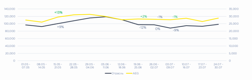 Показатель в первый месяц значительно ниже данных Inforce при аналогичной схеме работы. Это связано с тем, что изначальная узнаваемость бренда AEG была выше, поэтому при коротком периоде РК результат по этому параметру не так ощутим. Однако чем дольше длилась РК, тем интенсивнее рост.