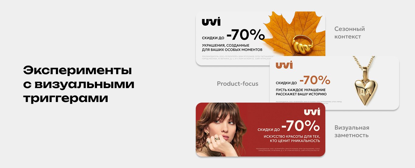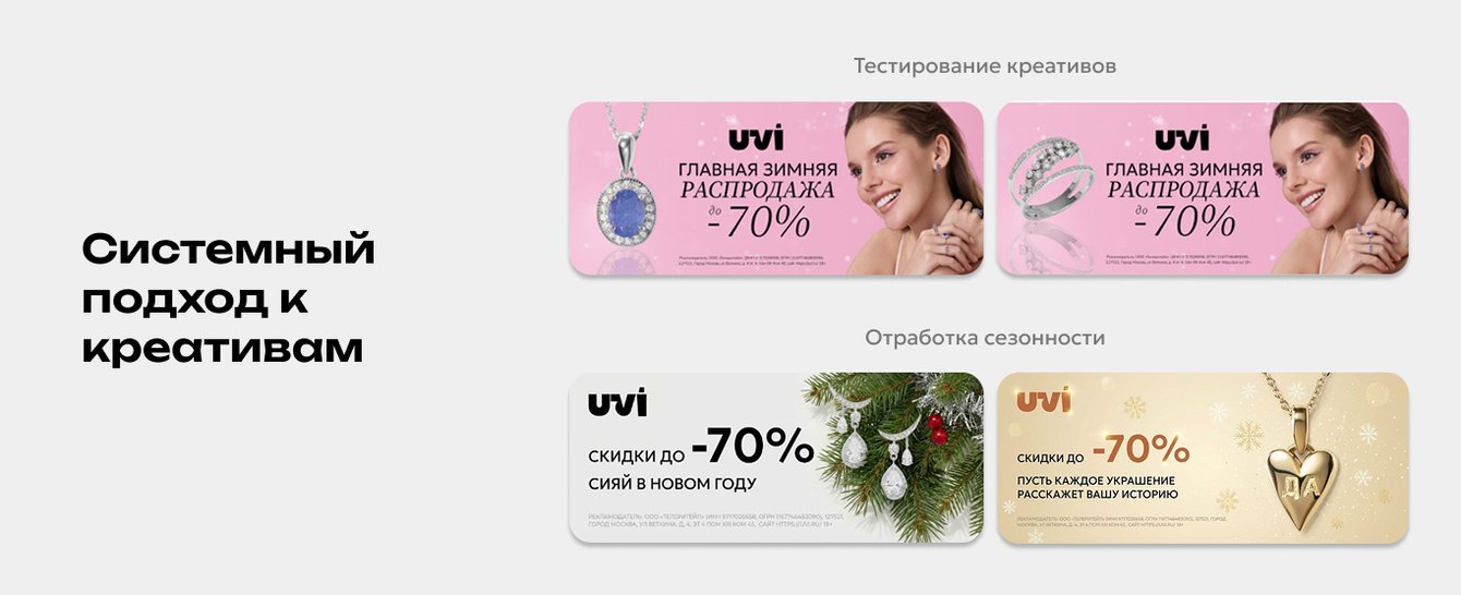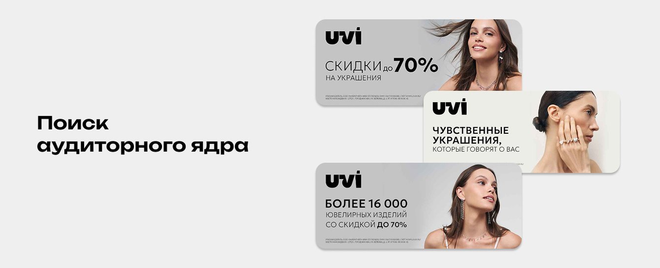 • Тестирование креативов: запускали один и тот же баннер с разными видами украшений и разбивкой на возрастные группы. Это помогло понять, какие изделия лучше откликаются разным возрастным группам, и предлагать наиболее релевантный продукт.