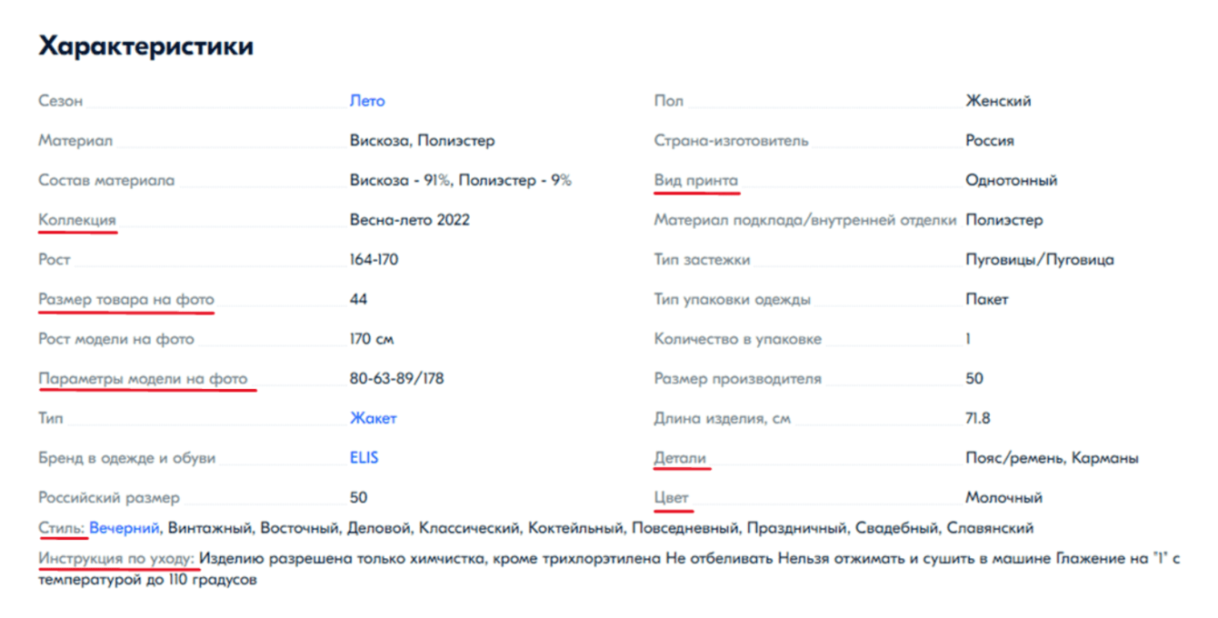 Заполнить характеристики товаров. Чтобы сделать карточку привлекательнее для покупателей и алгоритмов площадки, мы заполнили характеристики товара. Обязательно нужно проработать все эти поля: