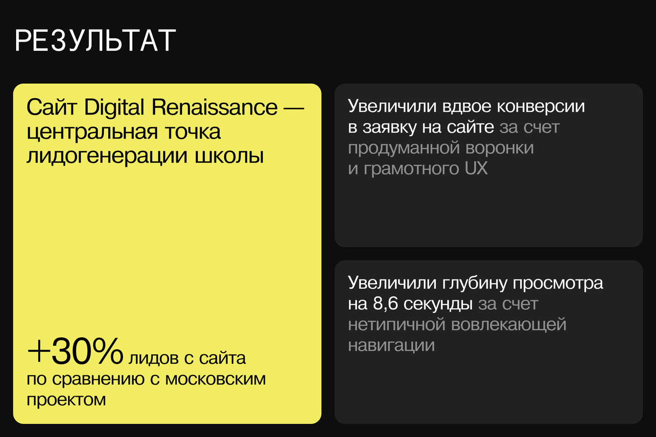 1. Привлечение целевой аудитории: школа уже набрала первый поток студентов, количество лидов по сравнению с московским проектом выросло на 30%;