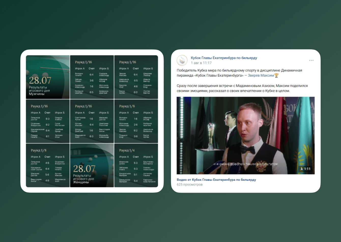 Запускали таргет ВКонтакте на бильярдистов для привлечения их к участию в турнире. Чтобы заинтересовать аудиторию, мы опирались на ключевые особенности турнира: