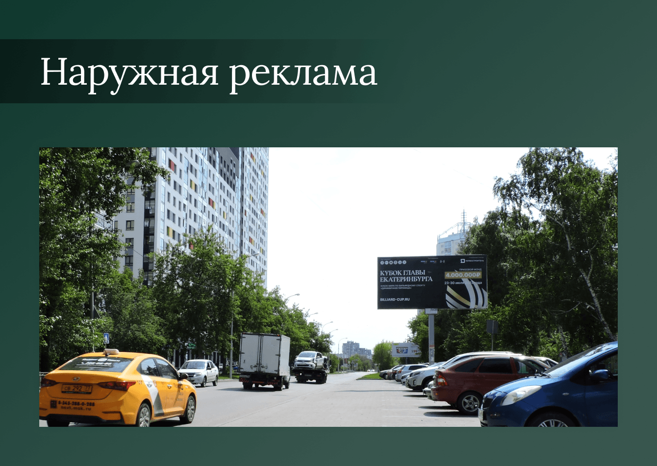 Размещение наружной рекламы, сюжетов на радио и телевидении, было сделано с целью охватить как можно больше жителей Свердловской области. Это помогало не только информировать горожан, но и популяризировать бильярд в целом.