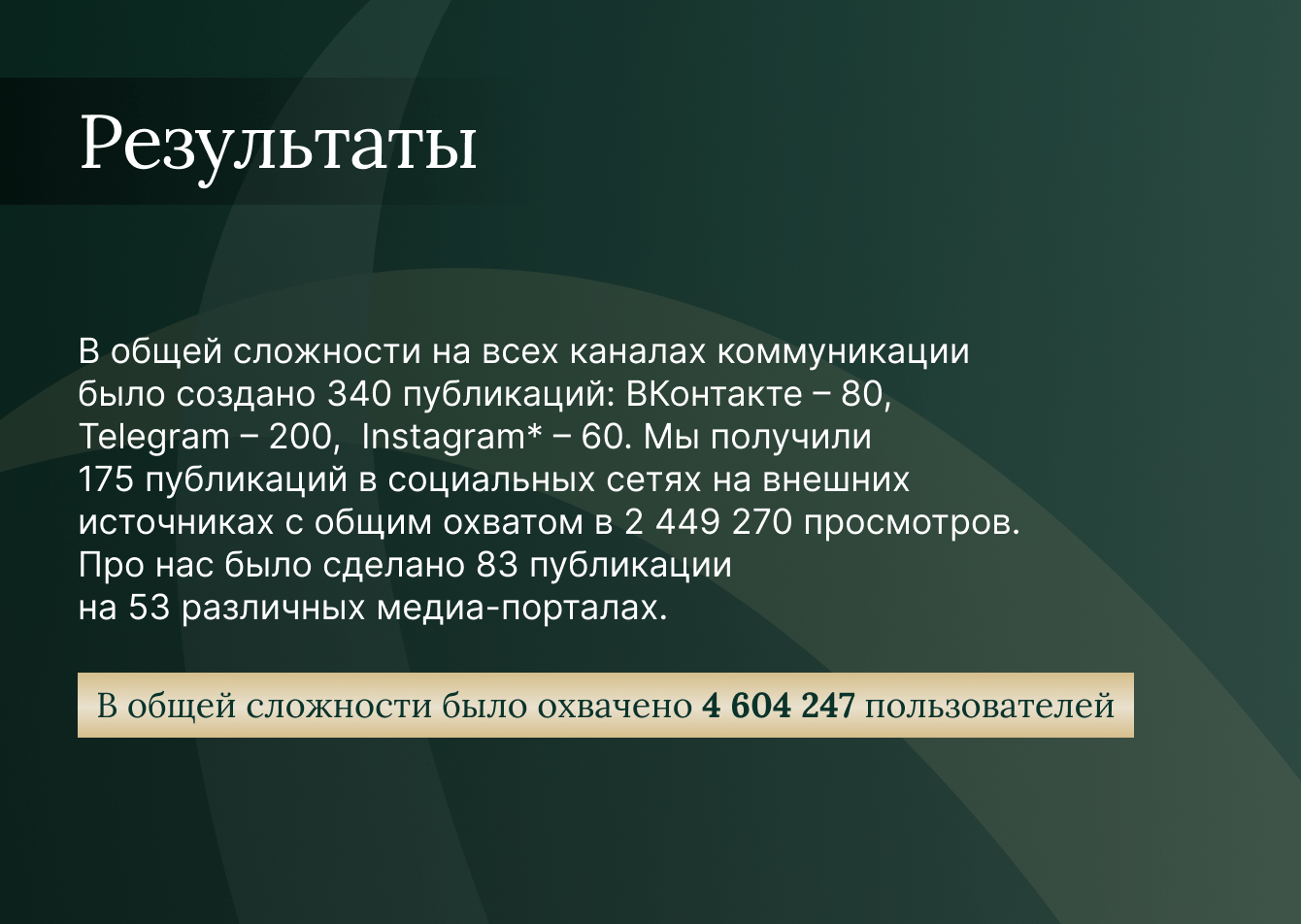 Мы сеялись в Telegram и ВКонтакте, для того, чтобы повысить узнаваемость и популяризировать бильярдный спорт. Это принесло нам 327 508 просмотров и 759 реакций.