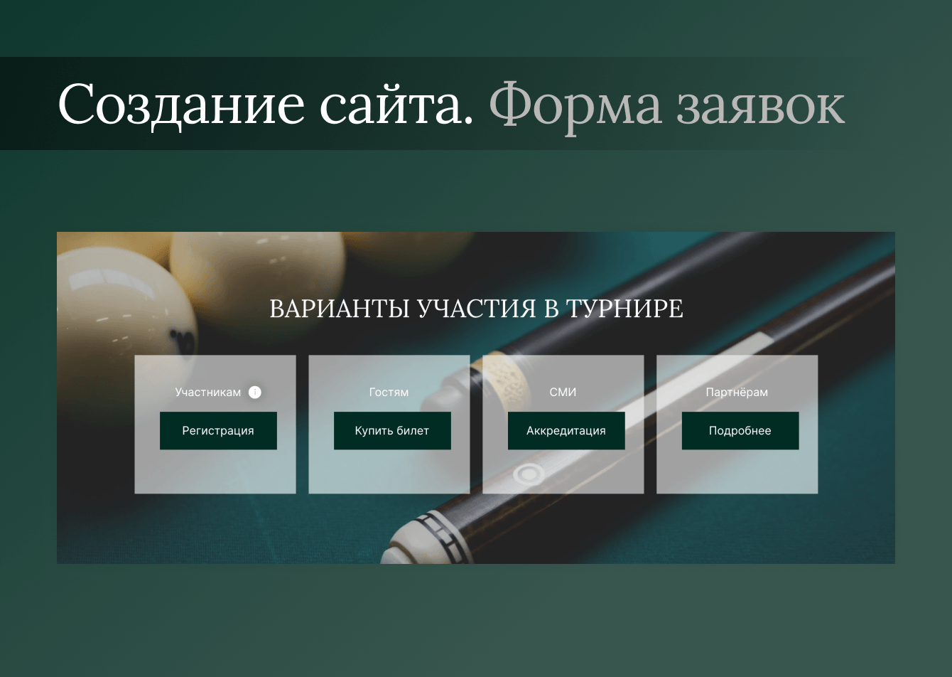 Мы поставили перед собой задачу отразить эксклюзивность бильярдного спорта. Помимо этого хотелось емко передать его лаконичность и динамичность.