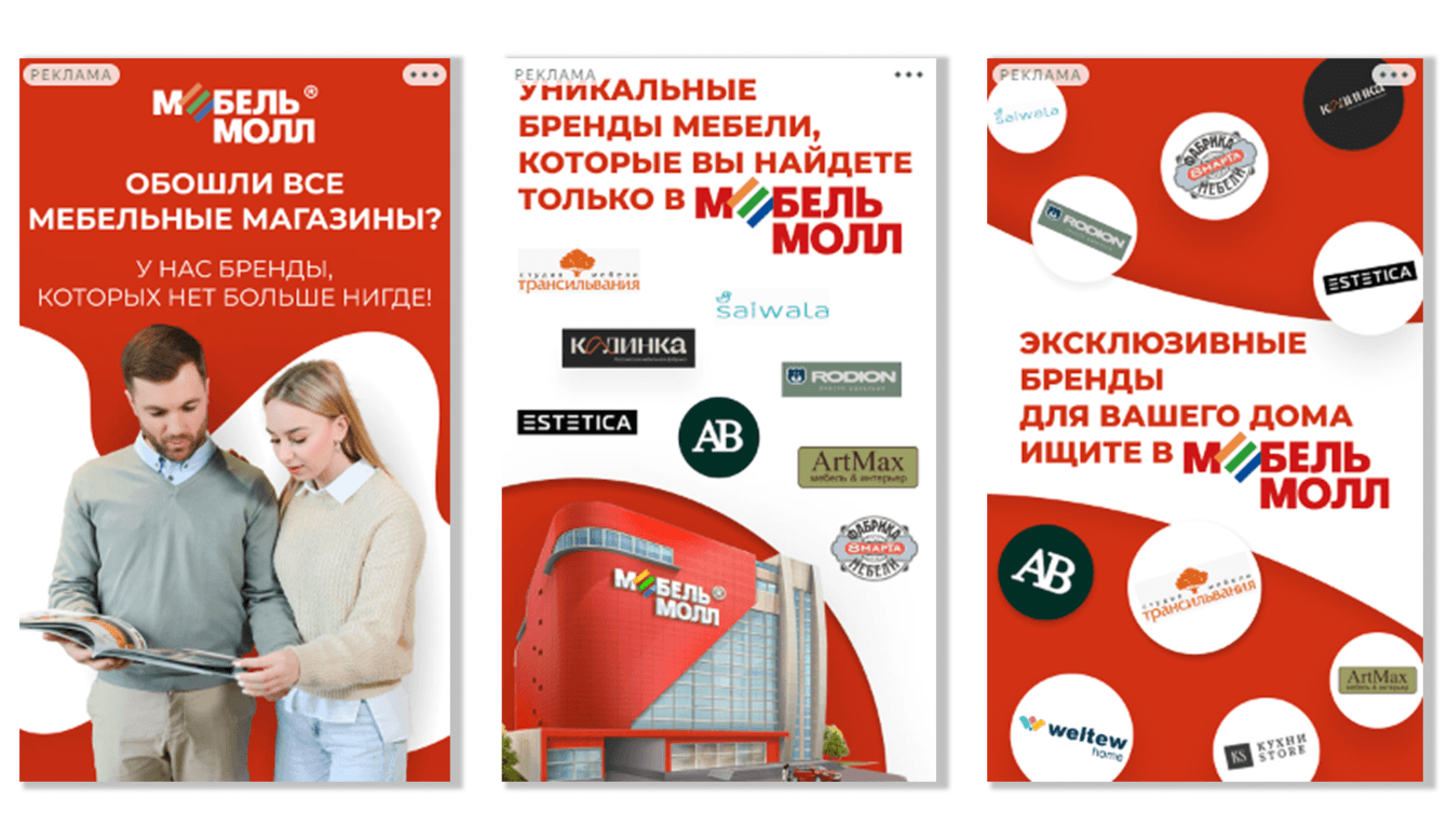 В течение года мы регулярно обновляли баннеры под сезонные акции и обновления коллекций. Акцент делался на визуальной эстетике интерьеров и четкой геолокации ТЦ