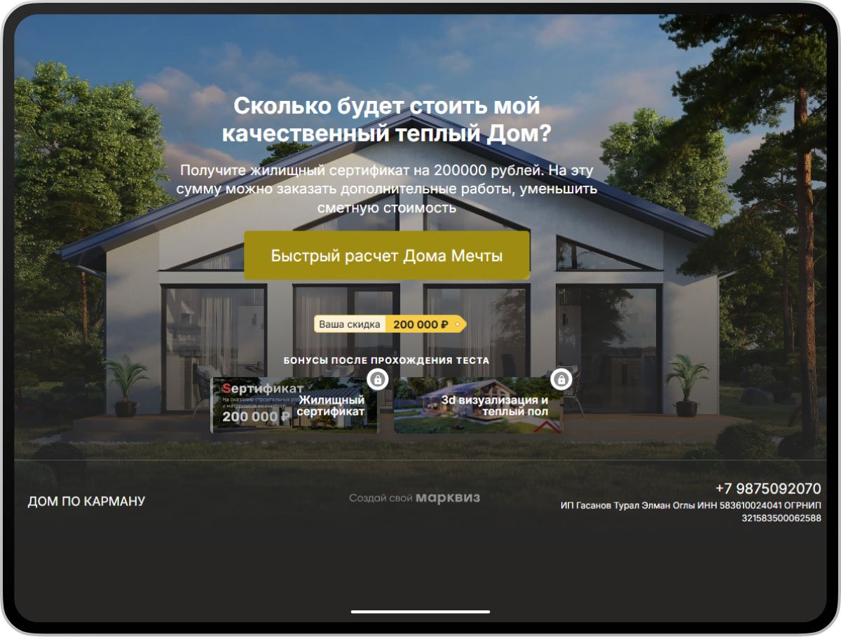 Интерактивный калькулятор помогал потенциальным клиентам самостоятельно рассчитать ориентировочную стоимость строительства на основе их предпочтений: тип фундамента, материалы, площадь, этажность и другие параметры.