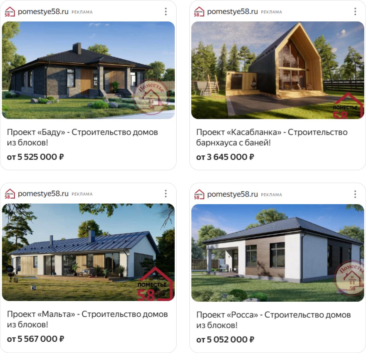 На их основе создали текстово-графические объявления по принципу: «название проекта — картинка — цена». Так, одно объявление рекламировало один проект, и вело на соответствующую карточку этого проекта на сайте.