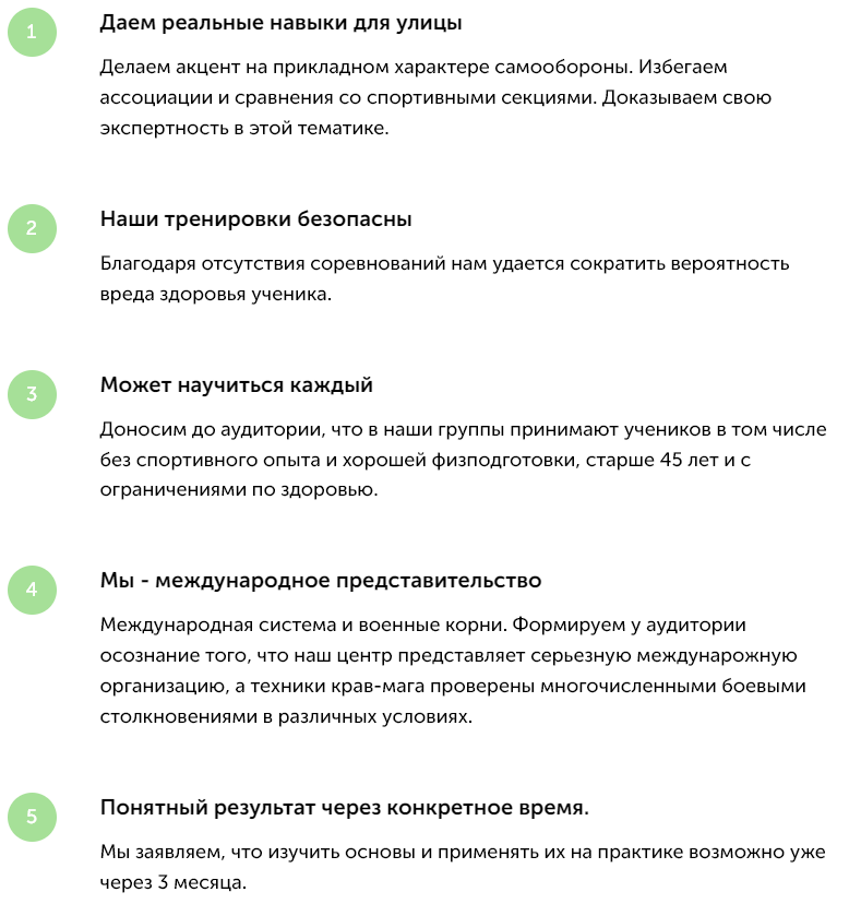 По всей странице размещены разнообразные призывы к действию, чтобы клиент мог вступить с нами в коммуникацию в момент максимального интереса, когда бы он не возник и что бы его не вызвало. Клиенту демонстрируются преимущества крав-мага как единоборства - следом предлагается попробовать бесплатно и убедиться в этом на практике. Клиент изучает информацию об инструкторах - может оставить заявку и задать им вопрос прям на сайте. Ознакамливается с видами групп - получает возможность оставить заявку на подбор оптимального графика для его занятий.