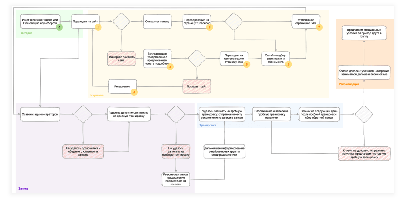 Клиентский путь должен быть спроектирован таким образом, чтобы беспрепятственно позволять перейти из стадии "холодного клиента" в "постоянного". При этому, важно учесть все многообразие сценариев клиентского поведения: где один позвонит сразу при виде объявления, второму понадобится несколько дней и серия визитов на сайт, чтобы просто подписаться на новостную рассылку.