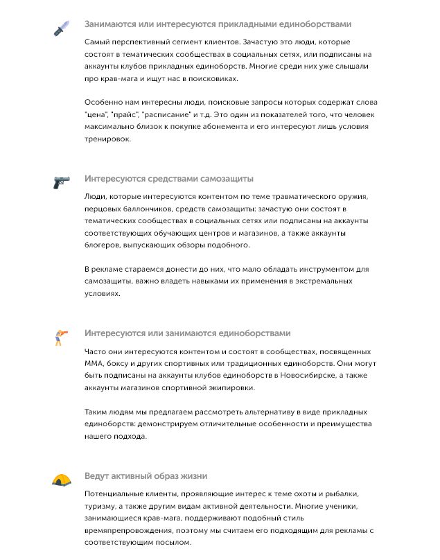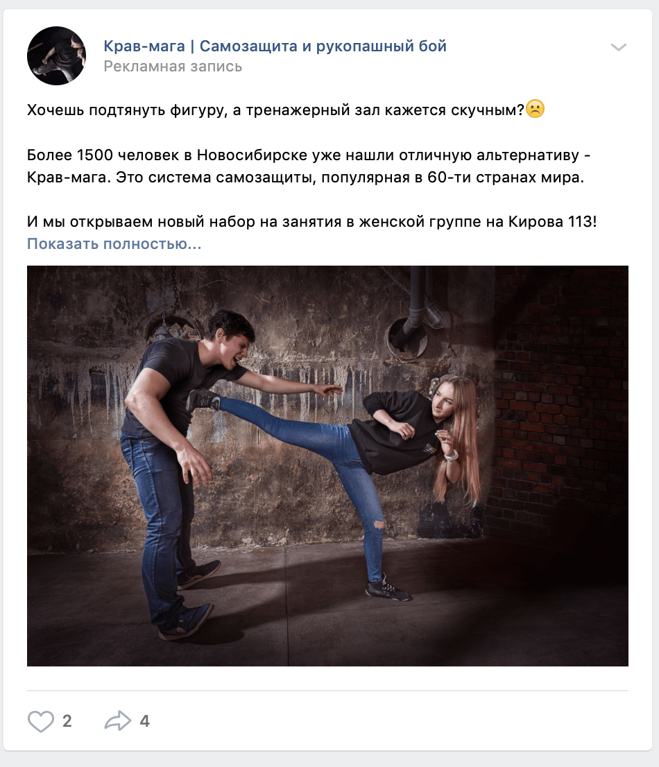Запустили рекламу не только на людей, которые целенаправленно ищут секцию самообороны, но и на околоцелевую аудиторию, которая находится в поисках других единоборств и спортивных секций: например, бокса, карате, тренажерного зала.