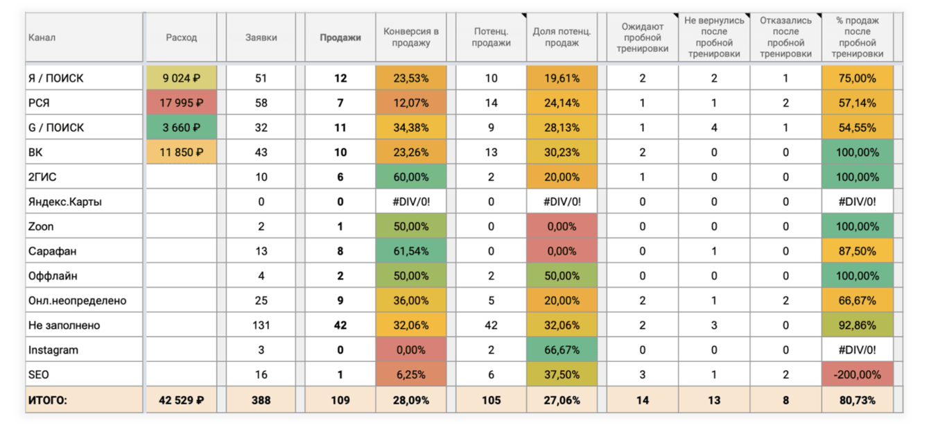 Теперь, когда наш маркетинг и продажи оцифрованы и систематизированы - сводим статистику из рекламных кабинетов и CRM в один отчет. Это позволит нам сопоставить данные о продажах абонементов и выручке с расходами на их привлечении.