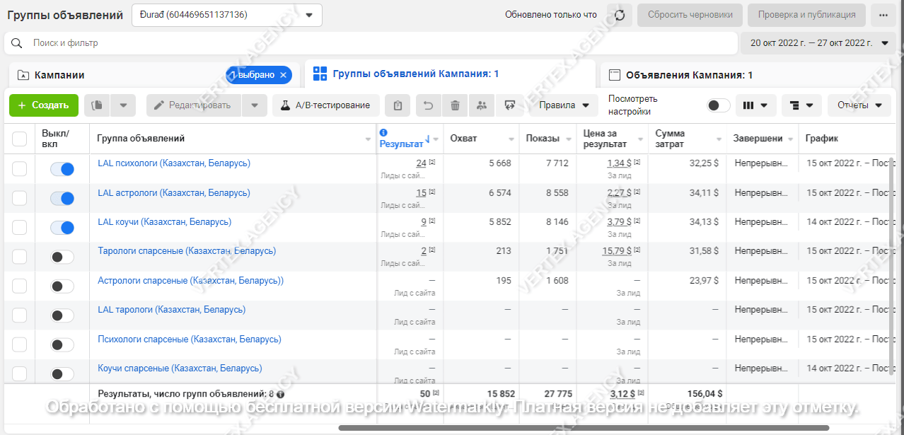 Первое - было решено тестировать на аудиториях психологов, астрологов, тарологов и коучей.Нам нужны были люди УЖЕ занимающиеся помощью другим людям. И мы их нашли через парсинг-программы. А потом создали похожие аудитории на те, что спарсили, по нужным нам территориям - Беларусь, Казахстан, Турция, Грузия, Великобритания, Саудовская Аравия.