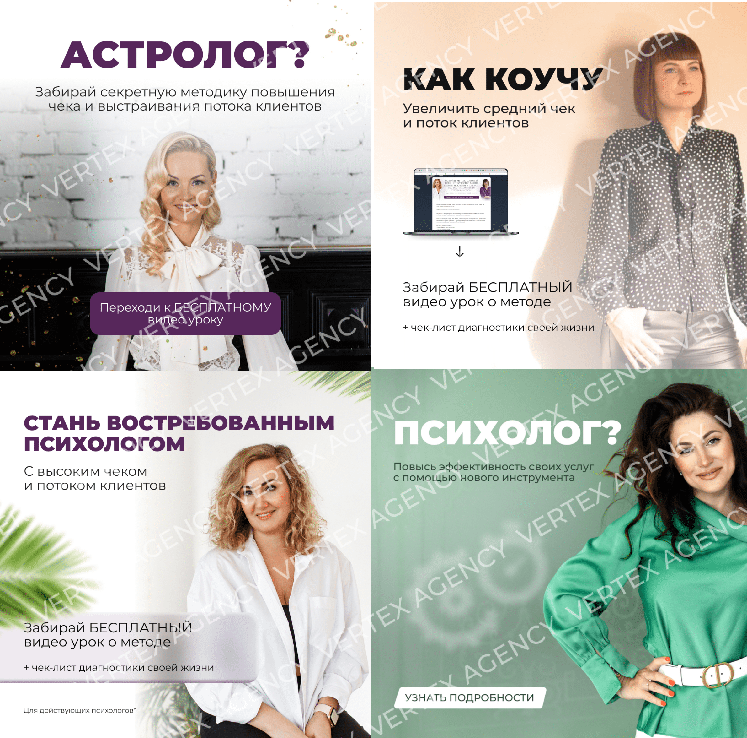 Все креативы и тексты были разработаны исходя из направления аудитории - для каждой профессии свой текст и креатив. В первую неделю лучше всего сработали похожие аудитории психологов, астрологов и коучей со следующими креативами: