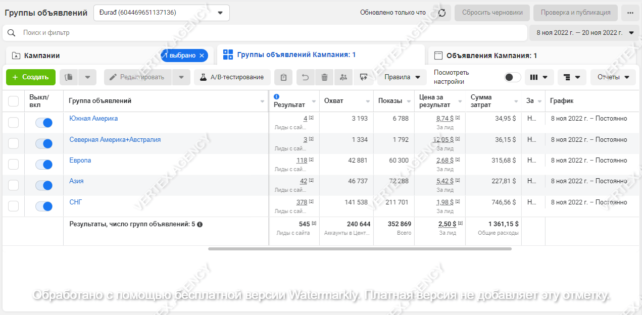 545 лидов за 7 дней работы с ценой за лид в 2,5 $, CTR 1,06 % - эта рекламная кампания оказалась самой результативной по итогам рабочего периода.