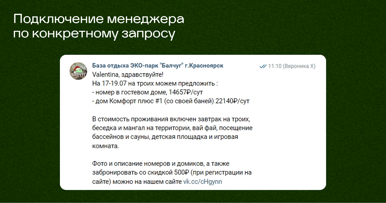 Мы отказались от прямого ведения трафика на сайт и внедрили чат-бот ВКонтакте как промежуточный этап между рекламой и бронированием. Бот знакомил пользователя с базой без участия менеджера и сразу на той площадке, где произошло первое касание (Вконтакте):