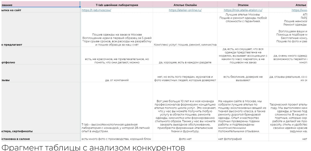 Таблица помогла еще раз убедиться в конкурентных преимуществах клиента, среди них — уникальное оборудование, которого почти ни у кого из ателье нет.