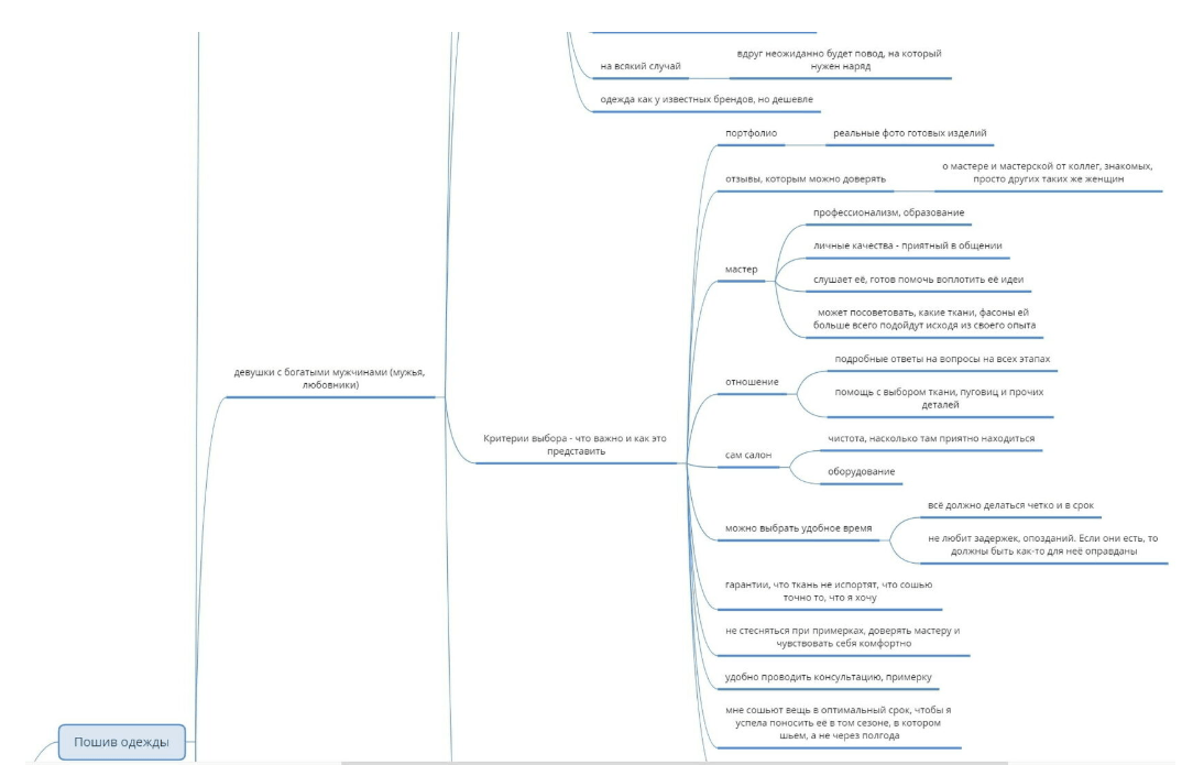 Поняли, что главное для ЦА — это локация мастерской, сроки, гарантия, отзывы, мастер и его отношение. Плюс у каждого сегмента свои дополнительные критерии выбора. Всю инфу собрали в майнд-карту и подготовили выводы по этапу, которые показали заказчику.