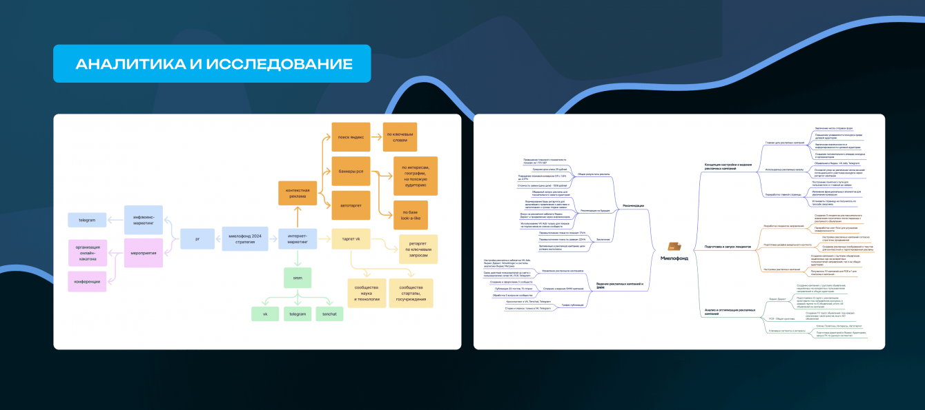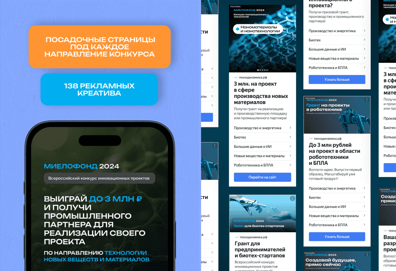 Контекстная реклама была настроена на 2 потока: поисковые кампании (для тех, кто активно искал конкурсы и гранты) и РСЯ (для формирования спроса среди потенциально заинтересованных пользователей).