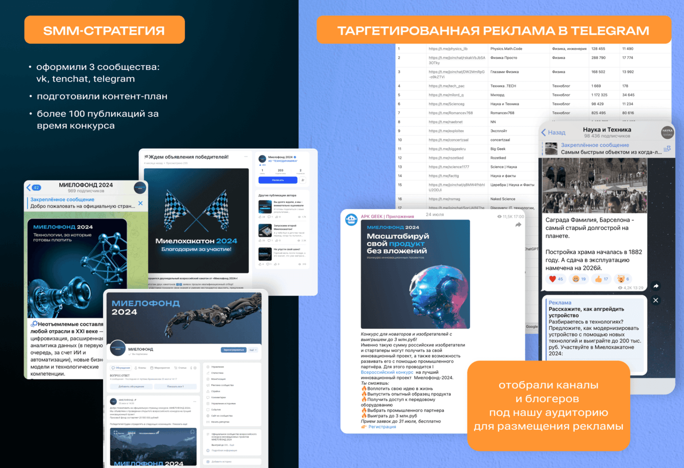 Создали три сообщества с нуля: VK, Telegram и Tenchat. За месяц проведения конкурса мы опубликовали более 100 постов.