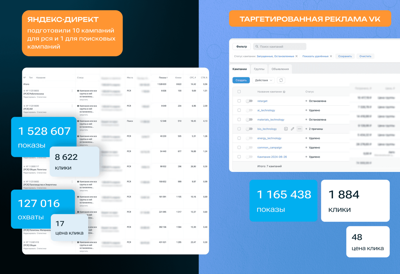 Анализировали эффективность объявлений, перераспределяли бюджеты, отключали неэффективные креативы. Ближе к концу приема заявок поняли, что направления «Биотехнологии» и «Материалы и вещества» сильно проседают по числу участников — перераспредели на них дополнительный бюджет для увеличения охватов и запустили рекламу на студентов университетов по этим тематикам, что позволило получить достаточно заявок по всем направлениям конкурса.