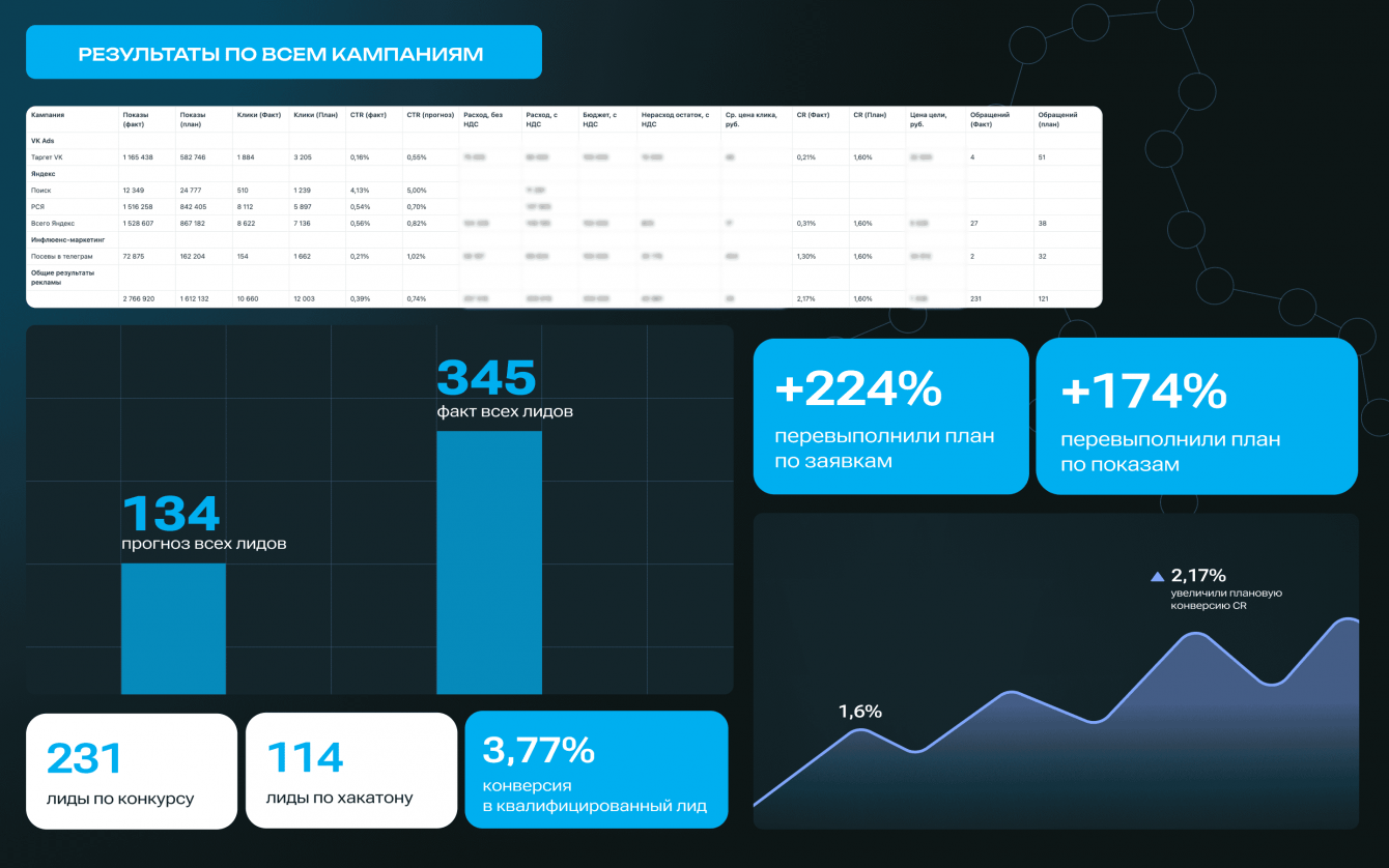 Ключевой целью рекламной кампании было увеличение числа отправок форм, но мы также работали над узнаваемостью, ростом вовлеченности и созданием положительного имиджа. Использовали Яндекс.Директ, VK Ads и Telegram, а основной упор сделали на ретаргетинг и максимальное количество касаний с потенциальными участниками.